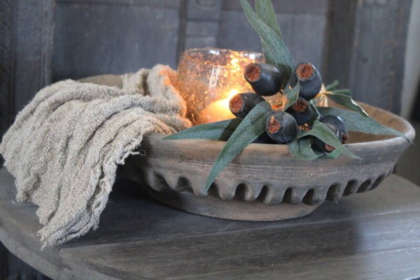 Unieke, oude stenen schaal met gave geribbelde onderkant. Je kunt deze schaal daardoor ook gerust omkeren met een windlicht erop. Ook leuk als fruitschaal. Geen recht toe recht aan schaal, maar heerlijk robuust.