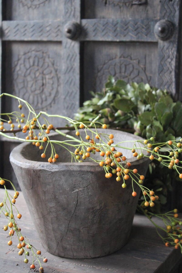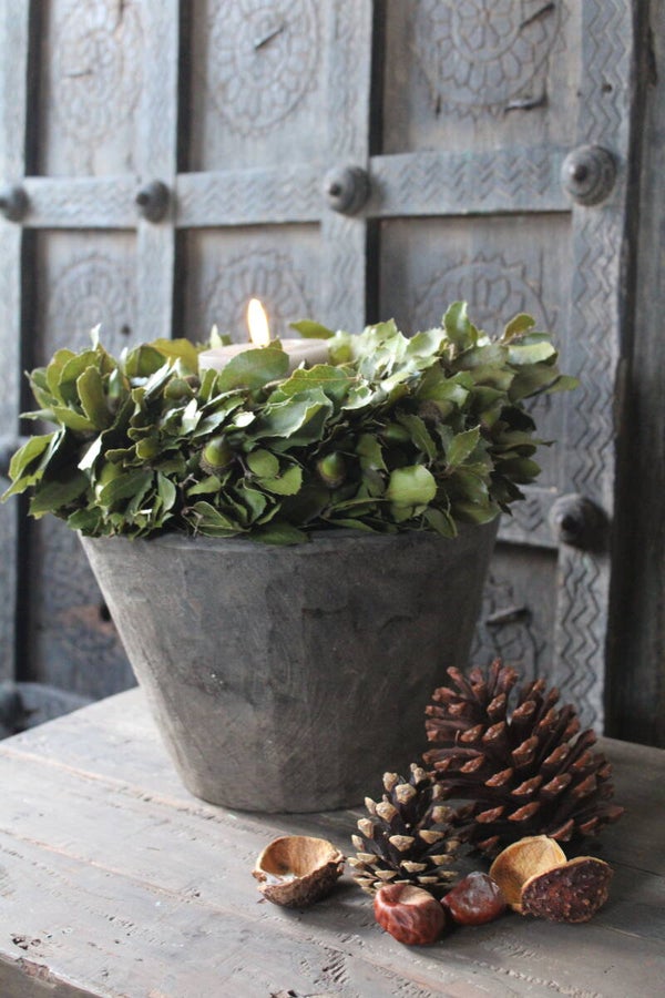Houten vijzel, heel sfeervol met bijv. een kransje erop, of met een bubbelglas of andere decoratie.