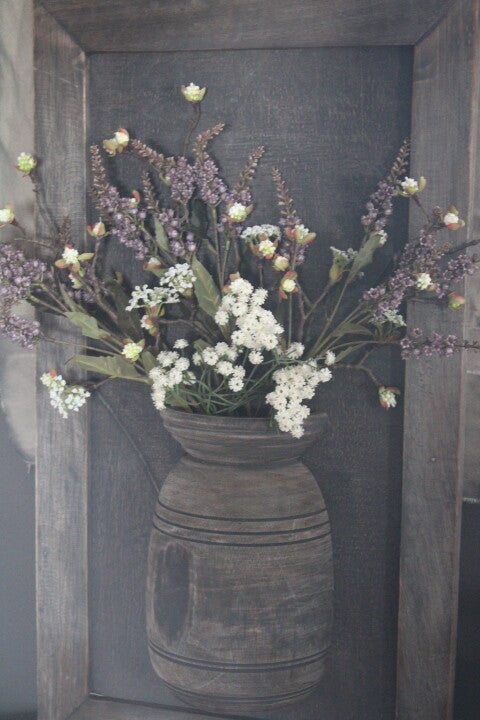 Houten wandpaneel met halve nepalese pot. Leuk te decoreren met zijden bloemen, toeven, lichtjes of wat je maar wilt. Elk jaargetijde iets anders.