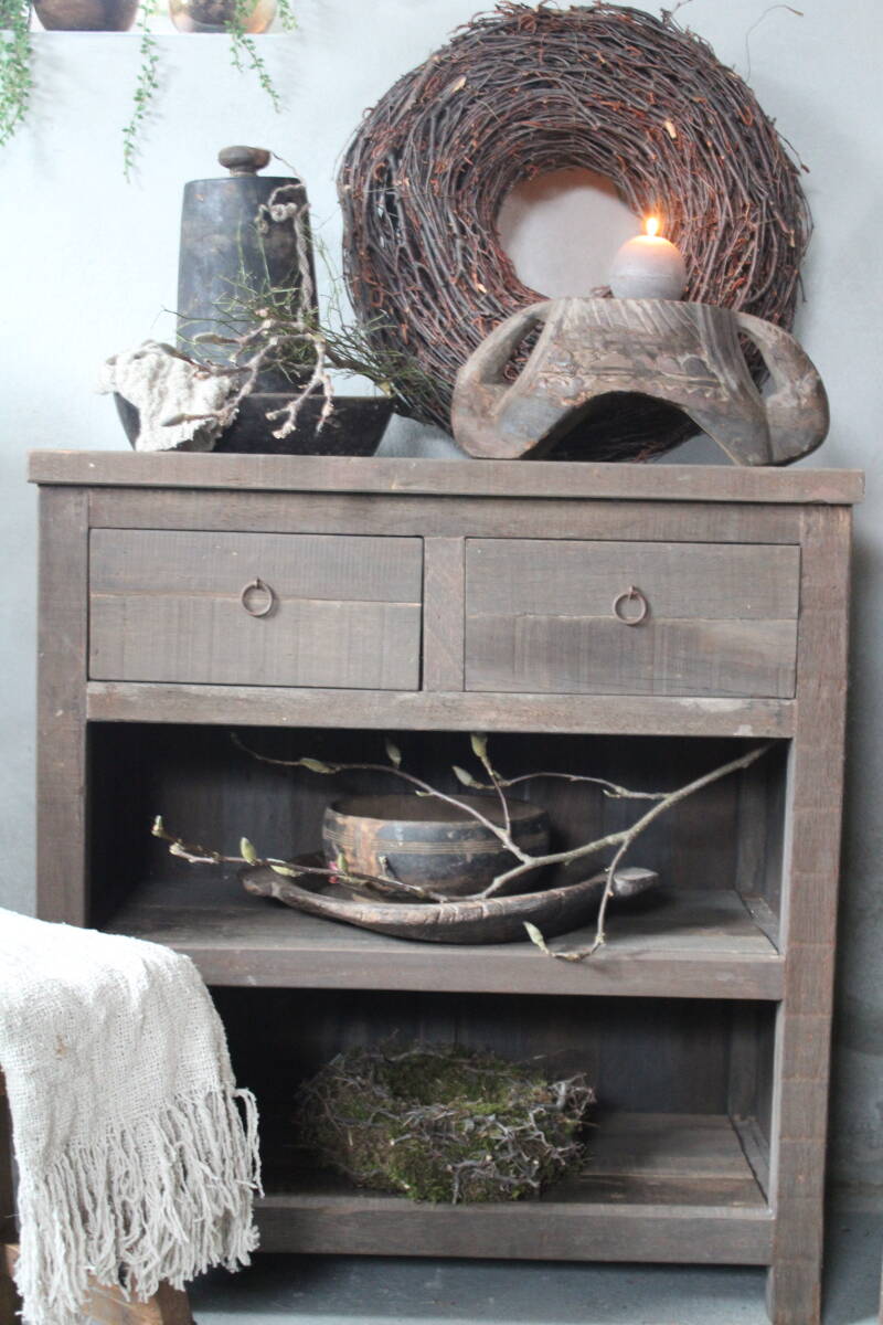 Deze sidetable is gemaakt van driftwood, gerecycled hout en geeft daardoor een robuuste uitstraling. Hierdoor is elk item uniek.afm. 80 x 40 cm, h 87 cm