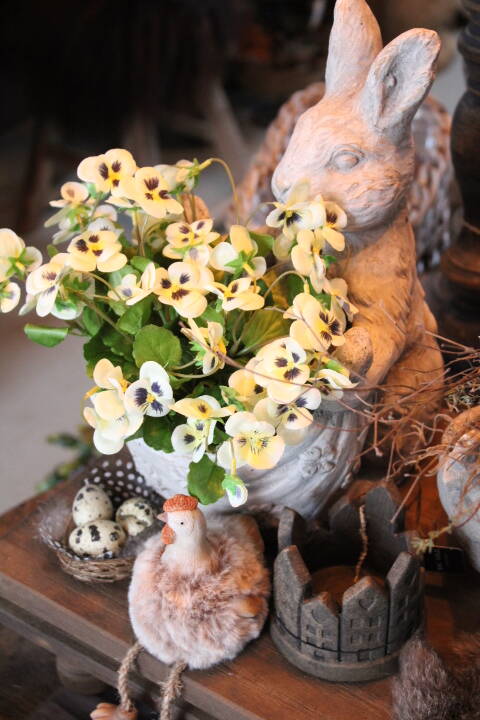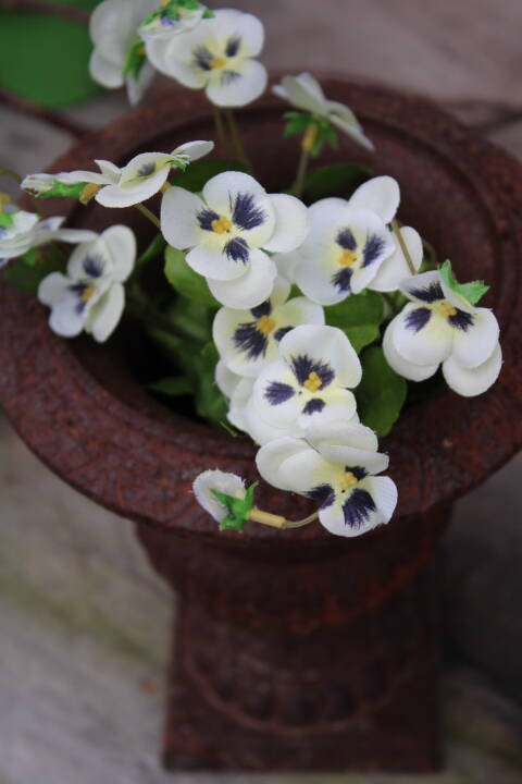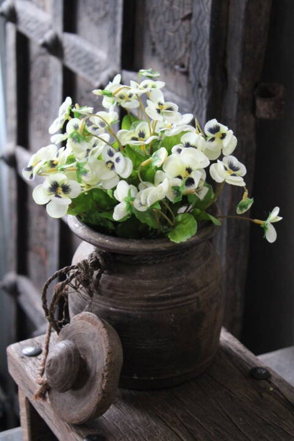 De viooltjes zijn ideaal om te combineren met sobere, landelijke woonaccessoires zoals een oude pot, kruik of schaal, maar zijn prachtig op zichzelf. Blijven mooi en zijn onderhoudsvrij. Wel sfeer en geen gedoe.