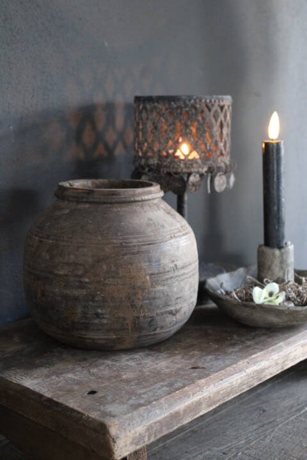 Deze robuuste bajot is gemaakt van oud, doorleefd hout en straalt eenvoud en rust uit. Elk exemplaar is uniek en heeft sporen van gebruik en oudheid.