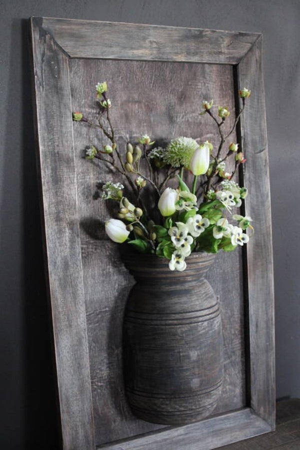 Houten wandpaneel met halve nepalese pot. Leuk te decoreren met zijden bloemen, toeven, lichtjes of wat je maar wilt. Elk jaargetijde iets anders.