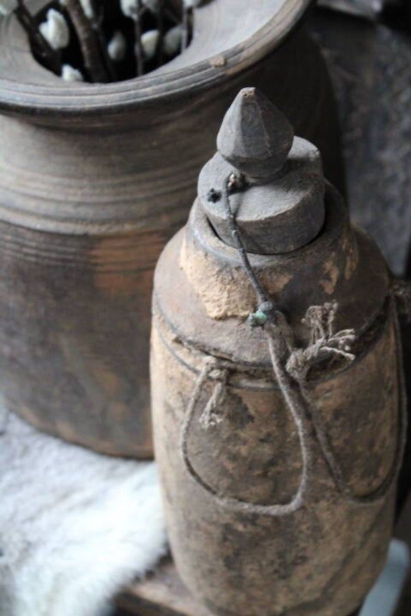 Deze oude, houten kruik ademt oudheid. Doorleefd, robuust en puur.