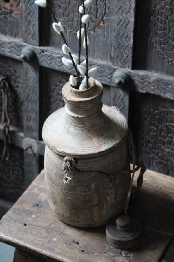 Deze oude, houten kruik ademt oudheid. Doorleefd, robuust en puur.