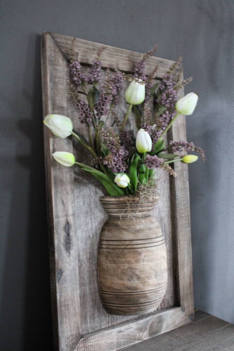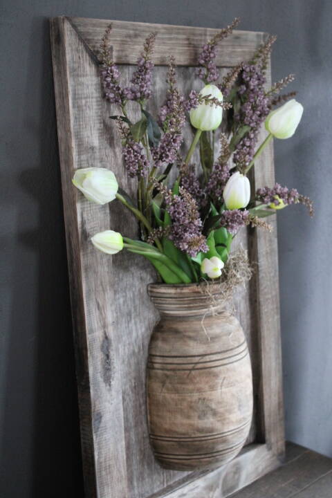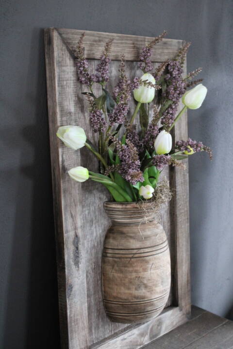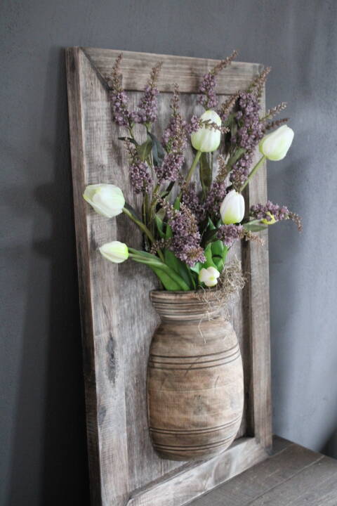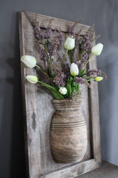 Sfeervol houten wandpaneel met halve nepalese pot mt M (excl. inhoud)