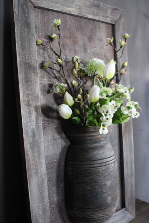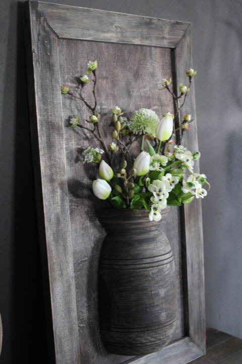 Houten wandpaneel met halve nepalese pot. Leuk te decoreren met zijden bloemen, toeven, lichtjes of wat je maar wilt. Elk jaargetijde iets anders.