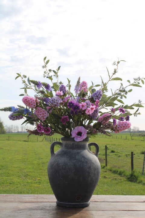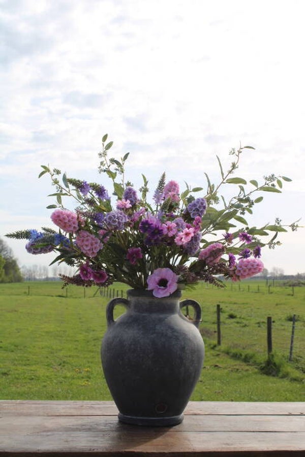 Jug / kruik met 2 oren Ancient Clay Brynxz. Een echte blikvanger in elk interieur, maar door de stoere, robuuste afwerking past deze zeker ook in een landelijk en/of sober interieur. Een plaatje en supertof te combineren met onze zijden bloemen (excl. inhoud)